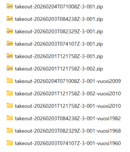 Zip-tiedostoja ladattuna Google Takeout -palvelusta. Olen purkanut ne ja lisännyt itse purkukansion nimeen tiedon vuodesta, jotta pysyisin jyvällä niiden sisällöstä. Vuodelta 2010 oli kuvia enempi, joten se pilkkontui kahdeksi zipiksi.